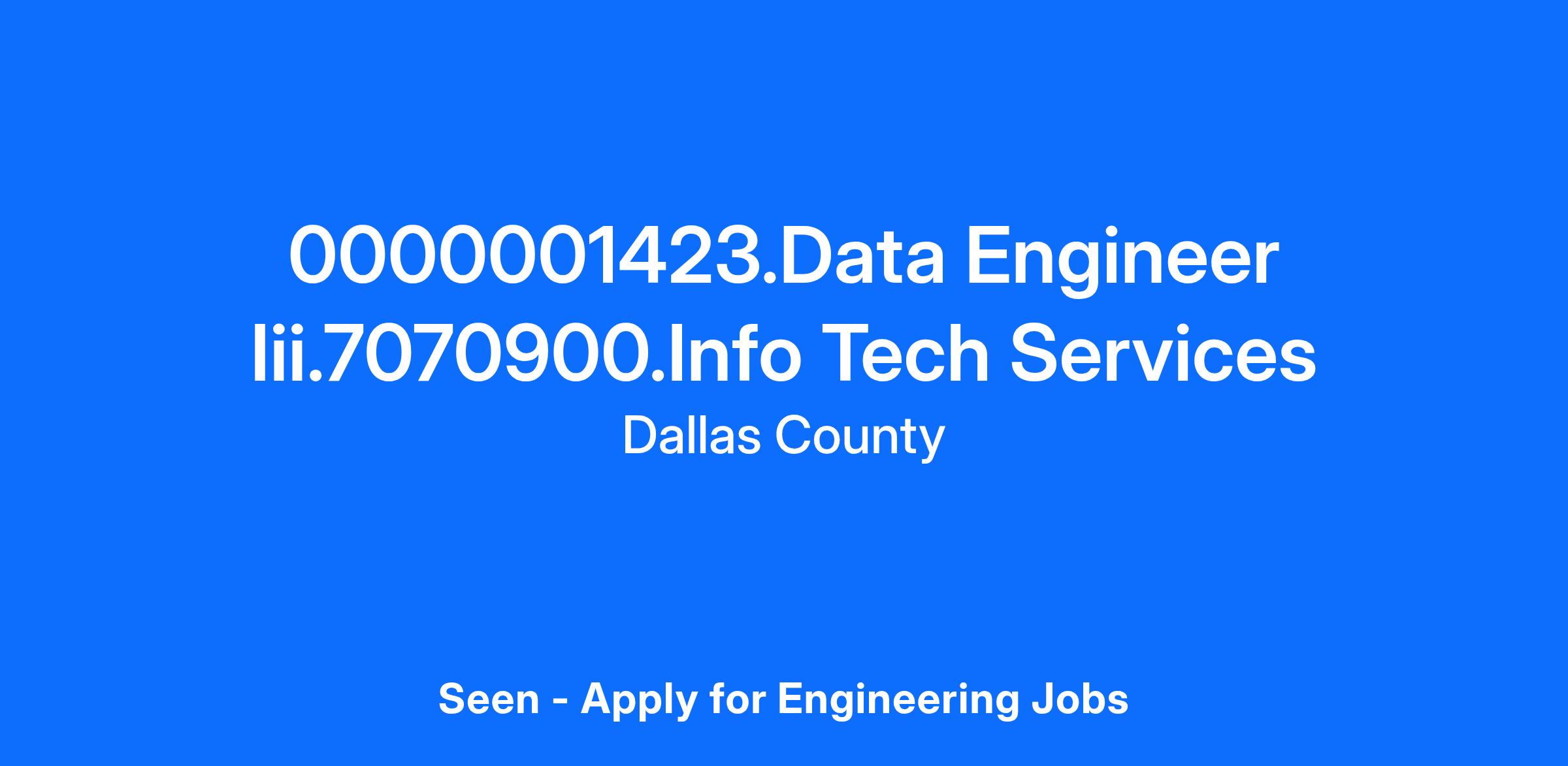 Education, Experience and Training: Education and experience equivalent to a Bachelor's degree from an accredited college or university in Computer Science, Information Systems, Data Analytics, or in a job-related field of study. Five (5) years of job-related experience in data engineering, data analytics, or AI/ML data processing. Certifications (Preferred): • Microsoft Certified: Azure Data Engineer Associate • AWS Certified Data Analytics – Specialty • Snowflake or Databricks certification Special Requirements/Knowledge, Skills & Abilities: • Ability to be analytical and problem-solve • Ability to lead technical design discussions and mentor others • Knowledge of performance, scalability, and data governance best practices • Skill in written and verbal communication across technical and business stakeholders • Skill in SQL and data modeling expertise (dimensional and relational) • Skill in data platforms such as Azure Data Factory, Databricks, Snowflake, or AWS Glue • Skill in Python, Spark, or similar languages for data processing • Knowledge of Agile, DevOps, CI/CD, and version control tools • Skill in SQL, Python, and modern data platforms (e.g., Azure Data Factory, AWS Glue, dbt, Airflow) • Skill in cloud data warehouses (e.g., Snowflake, BigQuery, Synapse) and orchestration tools • Knowledge of ML pipelines, streaming frameworks (e.g., Kafka, Spark Streaming), and data APIs • Knowledge of architecture, performance optimization, and automation • Skill in collaboration and communication with both technical and non-technical stakeholders • Ability to lead delivery of complex solutions while balancing scalability and maintainability • Ability to work in a fast-paced, evolving technology environment.  Must possess a valid Texas Driver’s License and good driving record. Will be required to provide a copy of 10-year driving history. Must maintain a good driving record and remain in compliance with Article II, Subdivision II of Chapter 90 of the Dallas County Code. “Individuals holding or considered for a position which has, or may have, access to criminal justice databases including the FBI Criminal Justice Information Systems, NCIC/TCIC and similar databases, must pass a national fingerprint-based records check prior to placement in such position and may be denied placement in such positions and/or access to such systems. Individuals must also maintain the ability to pass the records check while in the position or until such time that the Commissioners Court and the County Civil Service Commission deem this position no longer has this requirement.” Physical/Environmental Requirements: Occasional travel to County sites and industry conferences.