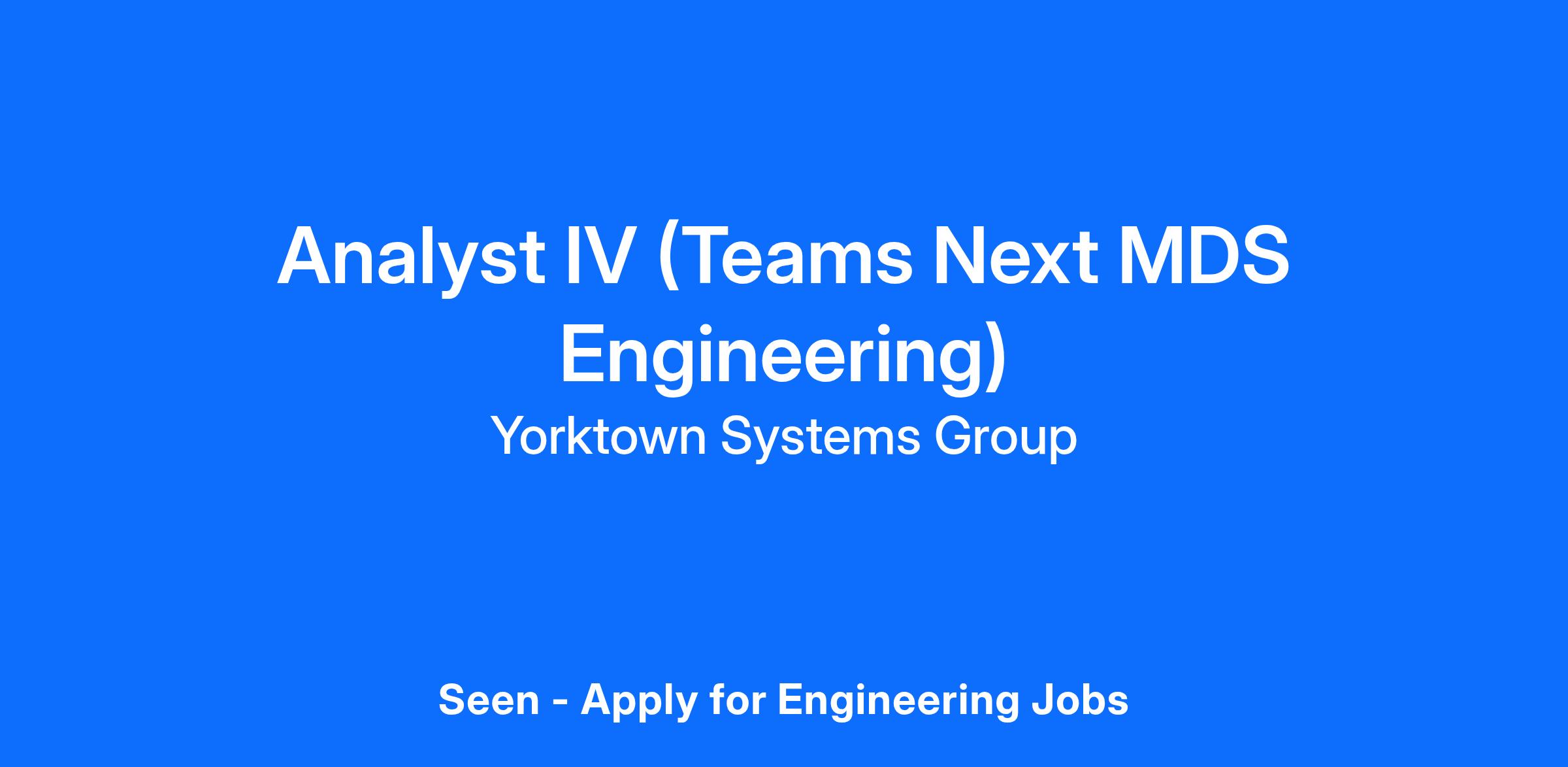 Yorktown Systems Group is seeking a highly qualified Analyst IV to support the Teams Next Missile Defense Systems (MDS) Engineering contract. The Missile Defense Agency's (MDA) mission is to develop and deploy a layered Missile Defense System (MDS) to defend the United States, its deployed forces, allies, and friends from missile attacks in all phases of flight.
