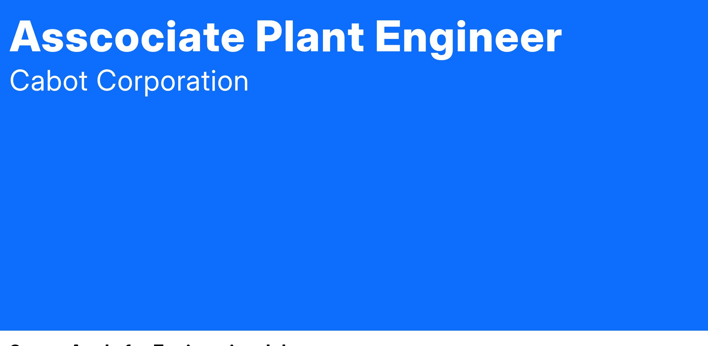 Cabot Corporation has an exciting opportunity for an Associate Plant Engineer to support the Hopkinsville KY plant. This person will assist with the technical support and improvements in manufacturing process capability, capacity and productivity at the site(s) to ensure safe and optimal process utilization and/or scale-up. They will use best practice machinery-care principles, implements world-class equipment care procedures and processes changes to maximize plant safety and reliability. Their work may also focus on particular products/line/units, plant process/equipment Reliability and/or Process Safety Management.