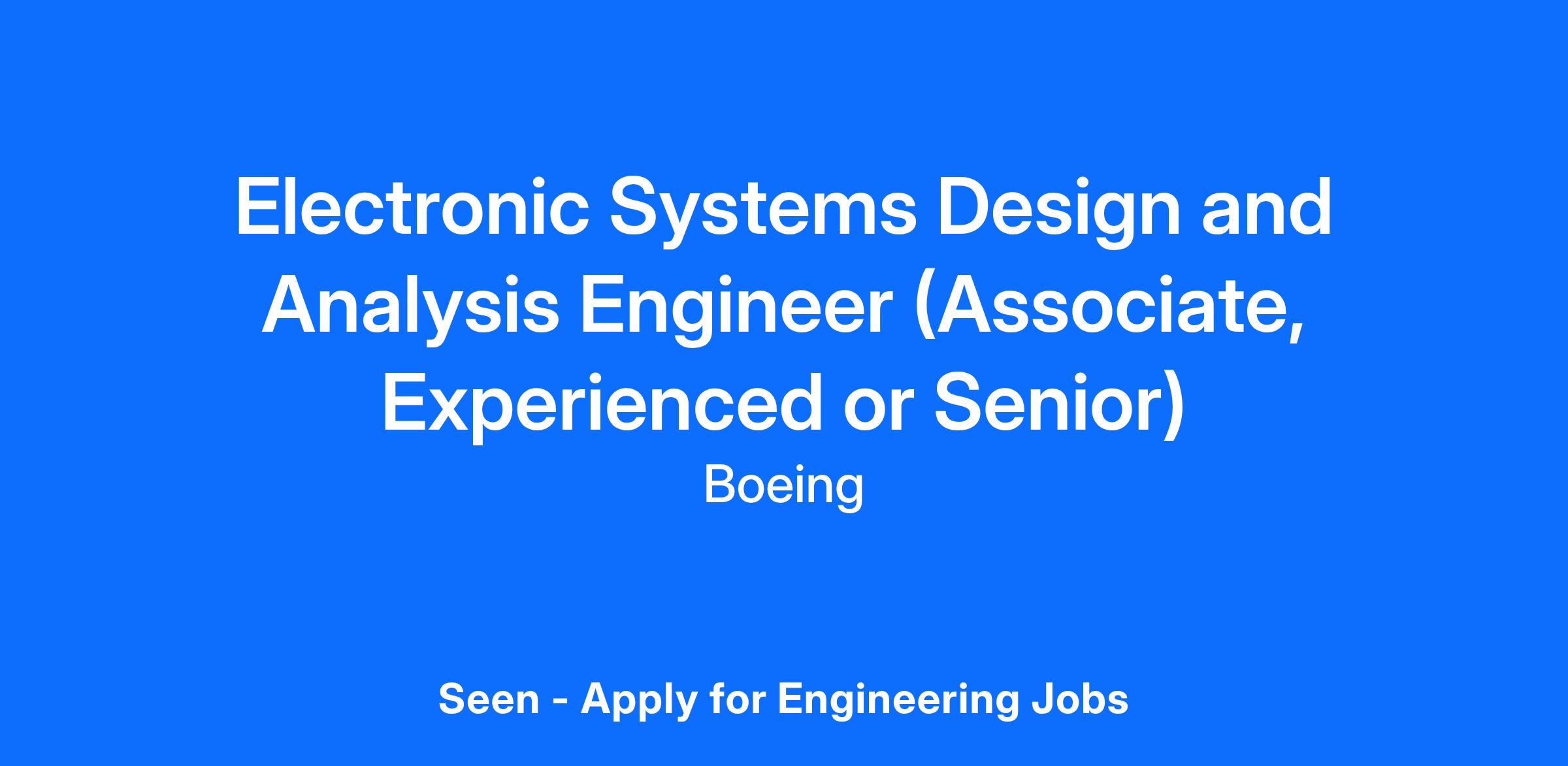 The Boeing CompanyBoeing Commercial Airplanes (BCA), is seeking highly driven and exceptional Electronic Systems Design and Analysis Engineers (Associate, Experienced or Senior) to join the 777X/787 Integrated Modular Avionics team in Everett, WA.