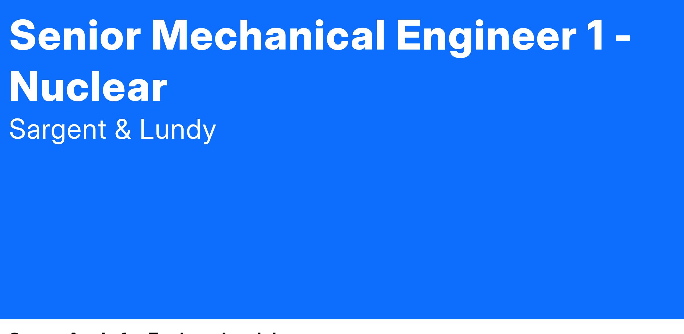 Join Sargent & Lundy's Nuclear Power Group and be part of a team driving the future of clean, carbon-free energy. Since 1954, we’ve been a trusted leader in nuclear engineering, design, and licensing, with expertise spanning small modular reactors (SMRs), advanced reactor technology (ART), and first-of-a-kind commercial reactor restart projects. Our work supports life extensions and digital modernization of existing nuclear plants, coal-to-nuclear conversion initiatives with the Department of State, and international nuclear new-build projects. With a commitment to safety, innovation, and sustainability, we provide cutting-edge solutions that power communities worldwide while reducing emissions. Shape the future of global energy with us!