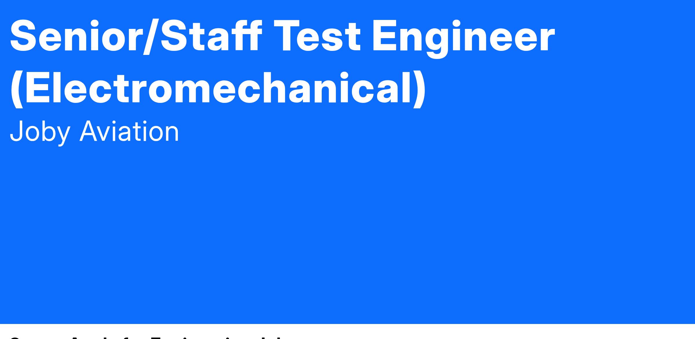 Joby Aviation is seeking a passionate, motivated and hands-on Senior/Staff Test Engineer to aid in characterization, performance, environmental and reliability testing of powertrain & electronics system comprising of electric motor, inverter and related systems and/or components. This role supports the Integrated Product Team (IPT) and leads the testing efforts on verification and validation testing activities for the propulsion systems.