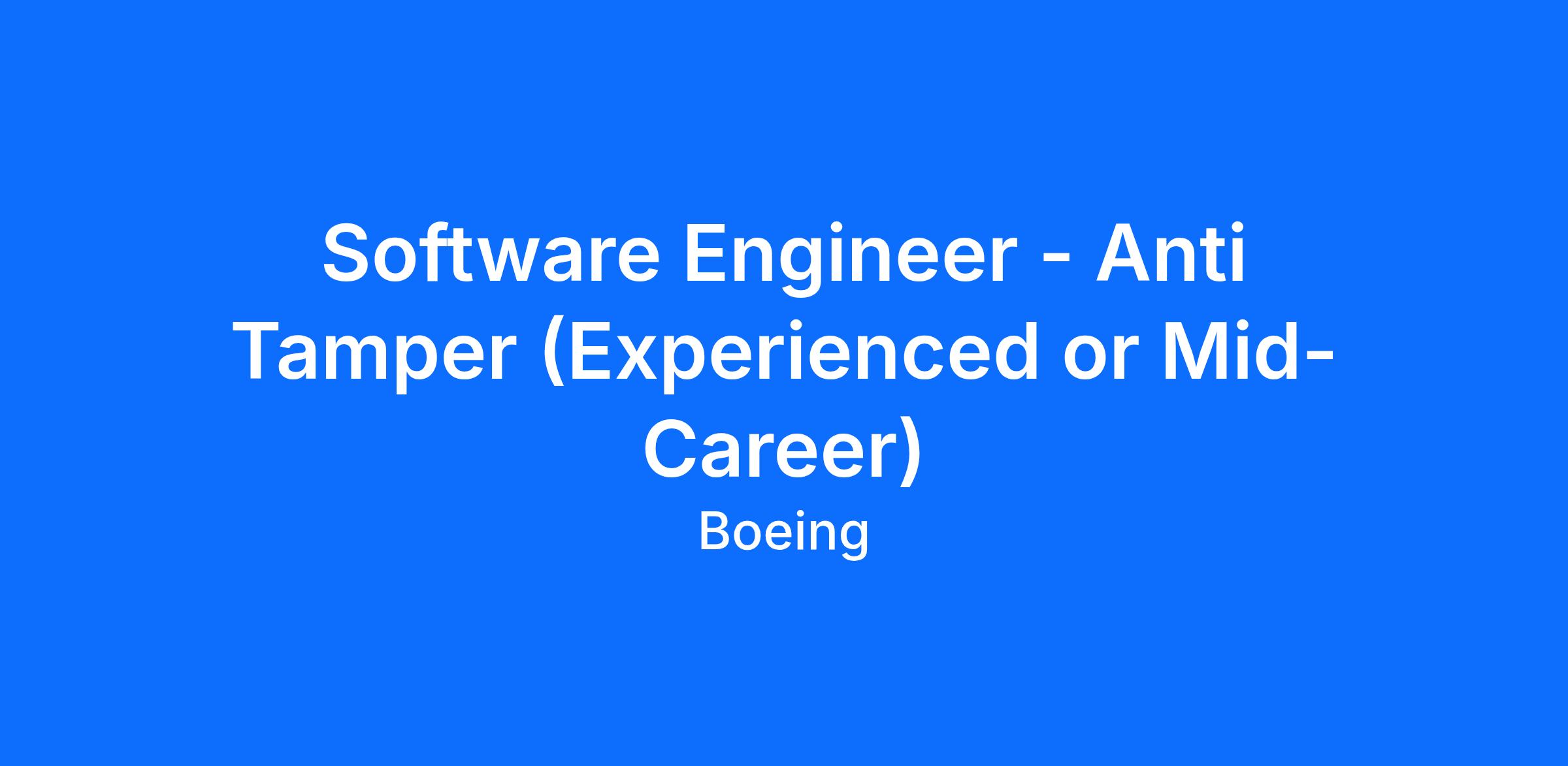 The Boeing CompanyAt Boeing, we innovate and collaborate to make the world a better place. Find your future with us to build something better for yourself and for our customers and for the world. The Product Security Anti-Tamper Team in Oklahoma City, Oklahoma is growing and currently seeking a Product Security Software Engineers. This position will focus on supporting the Mobility, Surveillance & Bombers (MS&B) division business organization.